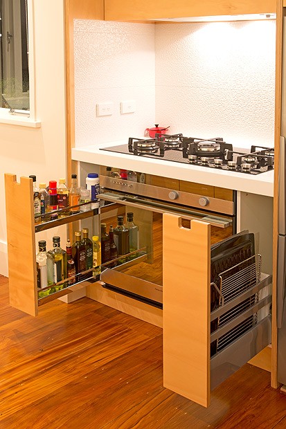 The two pullout fittings on either side of the Fisher & Paykel oven house tall oven trays and oil bottles, so everything is within easy reach of where it will be used. Activity Zoning in action!