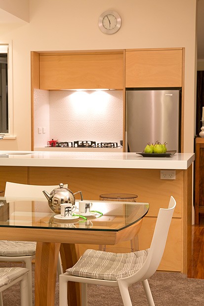Simplicity rules in this kitchen. The rich grains of the hoop pine plywood veneer provided the base colour palette and the holiday feel of the owners’ home. This is contrasted with crisp white of the Corian benchtop and various stainless steel accents.