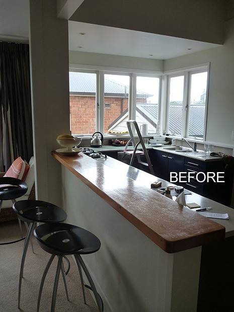 Handles were created from exposed cutouts in the cabinets, which not only saved space but also highlighted the plywood edge detail on the cabinetry.