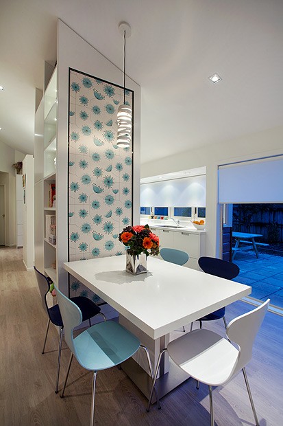The personal touch of delicately patterned wallpaper facing out to the entrance and dining, continues the fresh colour theme from the kitchen. This is constructed for easy replacement in the future should tastes change or damage occur.