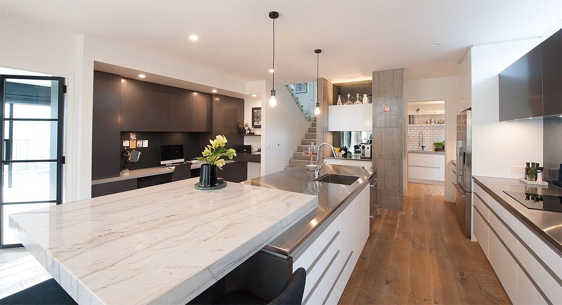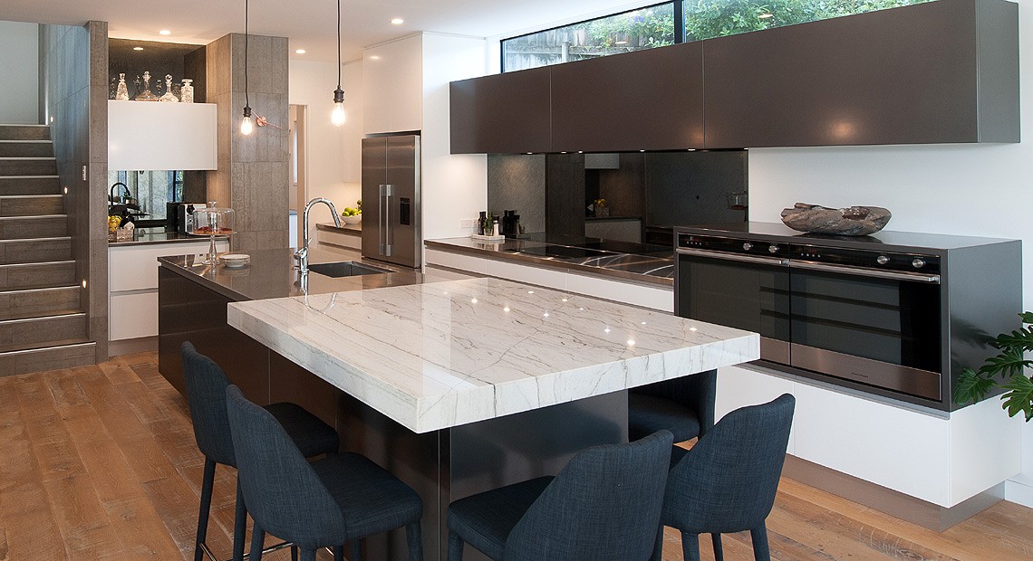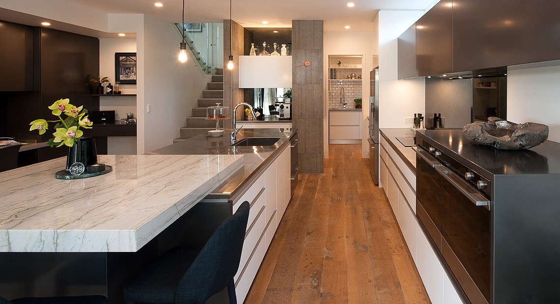 A large breakfast table in richly cross-grained quartzite, cantilevers confidently out above the stainless capped island. This showpiece rests firmly on a dark steel-look base further anchoring the island to the loft-like timber floor.