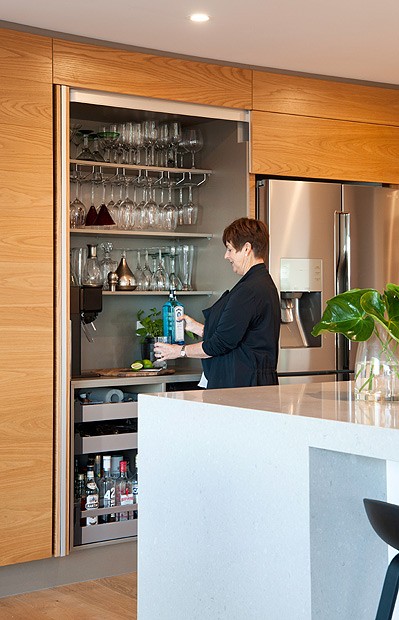 Behind fold back bi-fold doors, a dedicated drinks zone in stainless steel hues houses everything needed for entertaining or a quiet night at home.