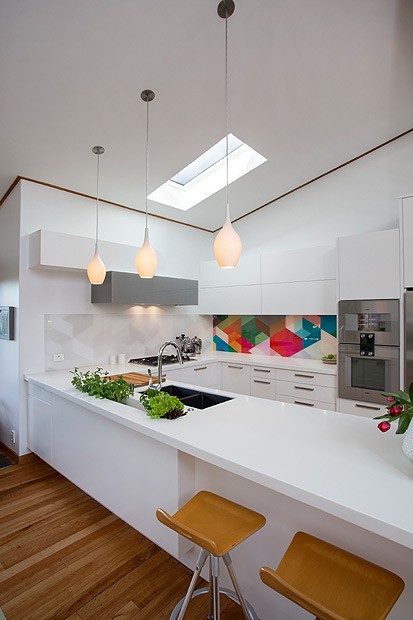 A wallpaper design the owner had loved for years became the basis for our ‘creating soul’ and edginess. The exciting spectrum of 3D geometric, multi-coloured triangles were shaded and manipulated with a graphic designer to create an eye-catching labyrinth of translucent, overlapping and interlocking cubes on the glass splash-back.