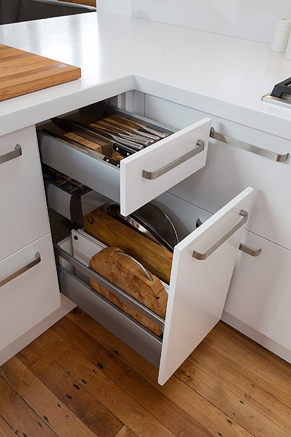 The drawers are fully customised with accessories for logical organisation and workflow relevance. Seen here is a custom knife block and bread boards drawer; perfectly located in the food preparation Activity Zone.